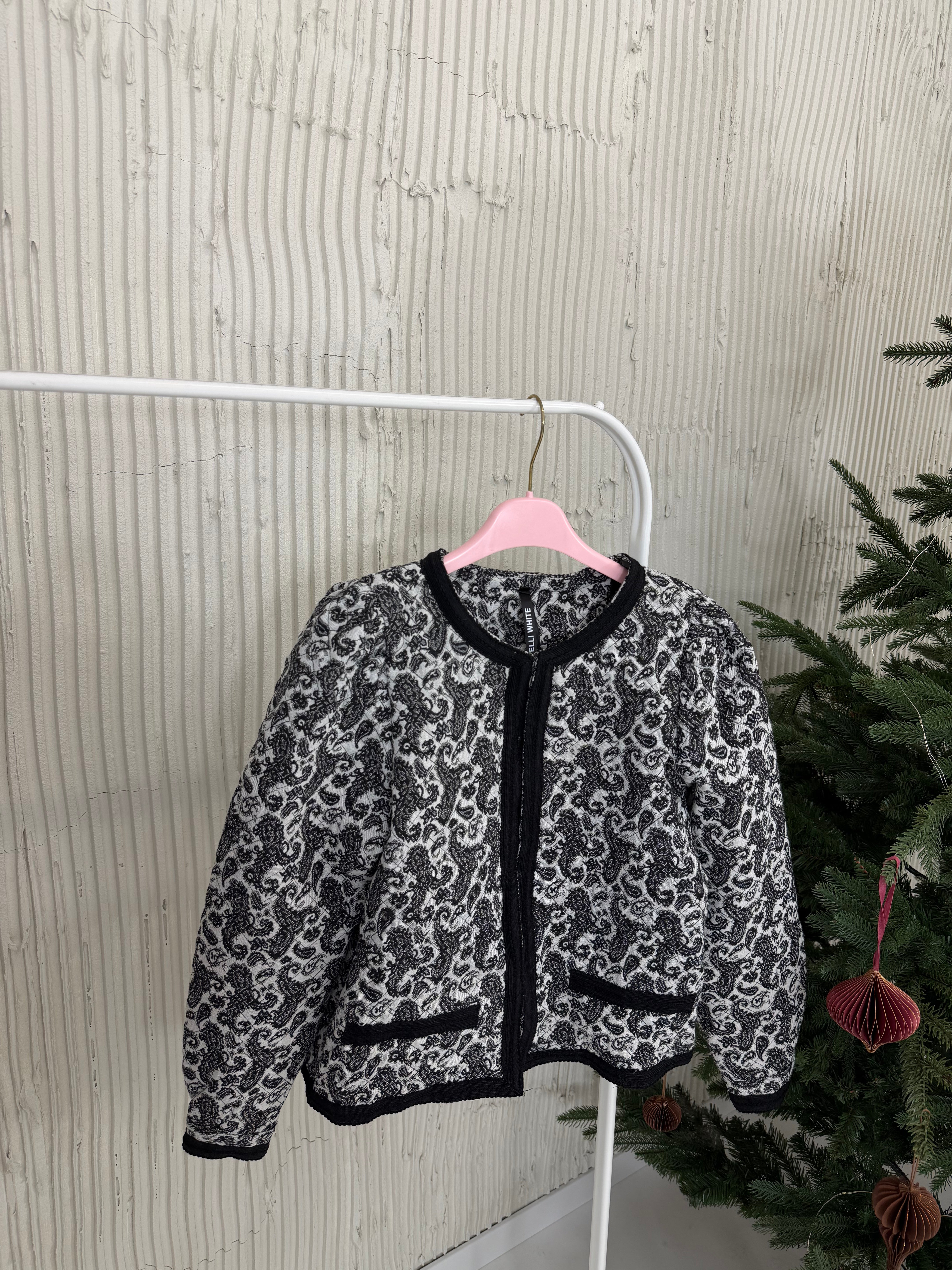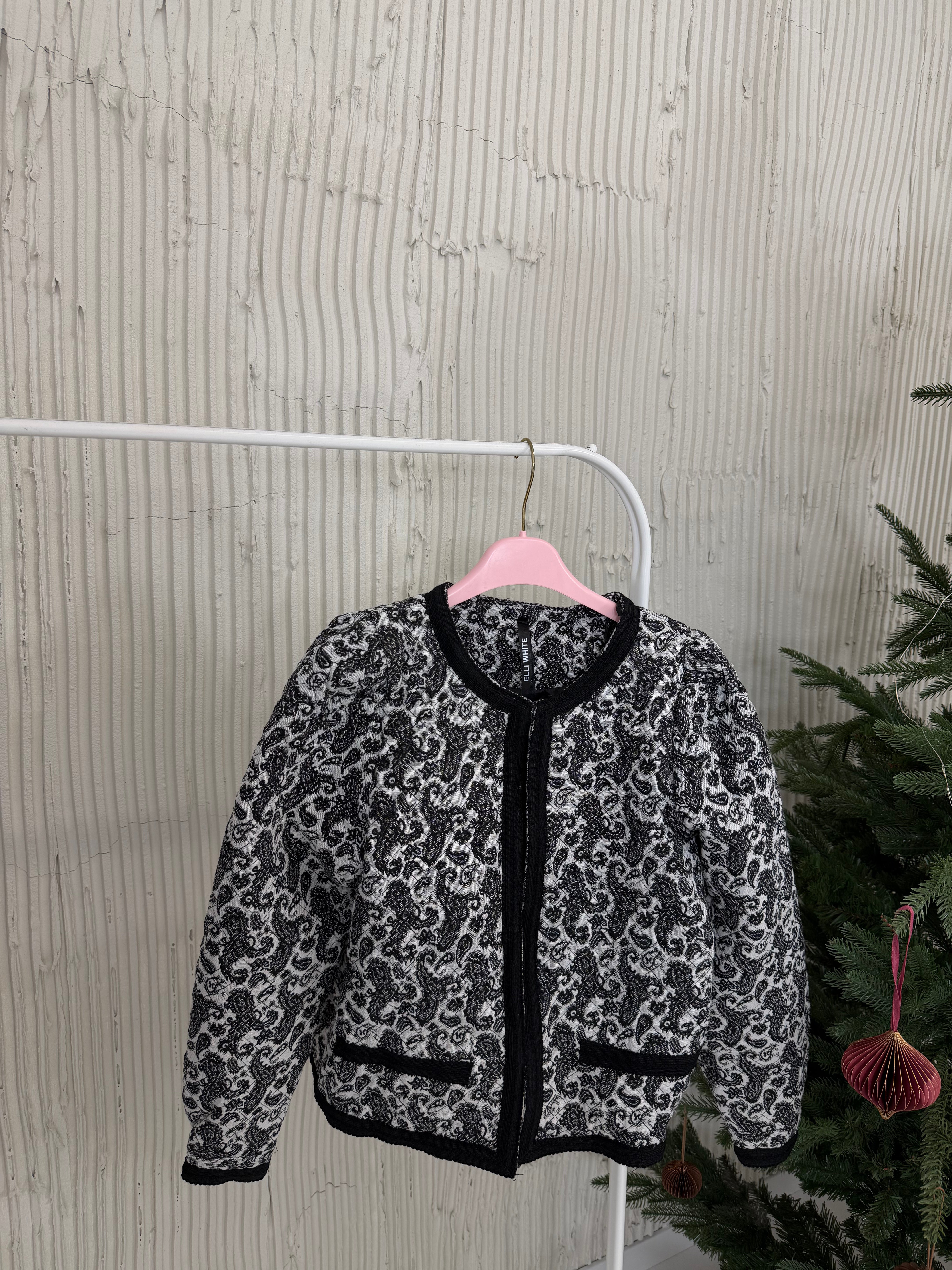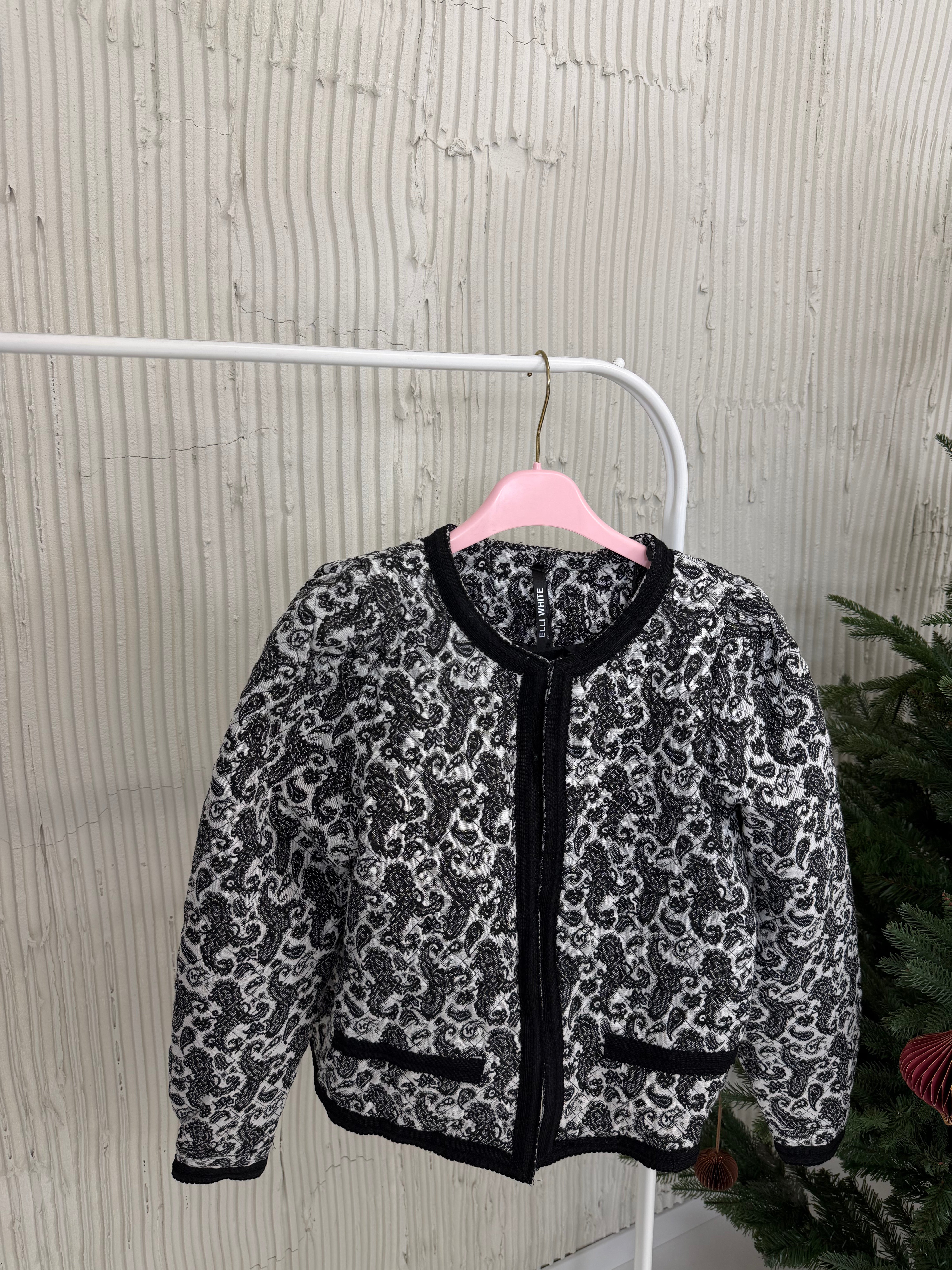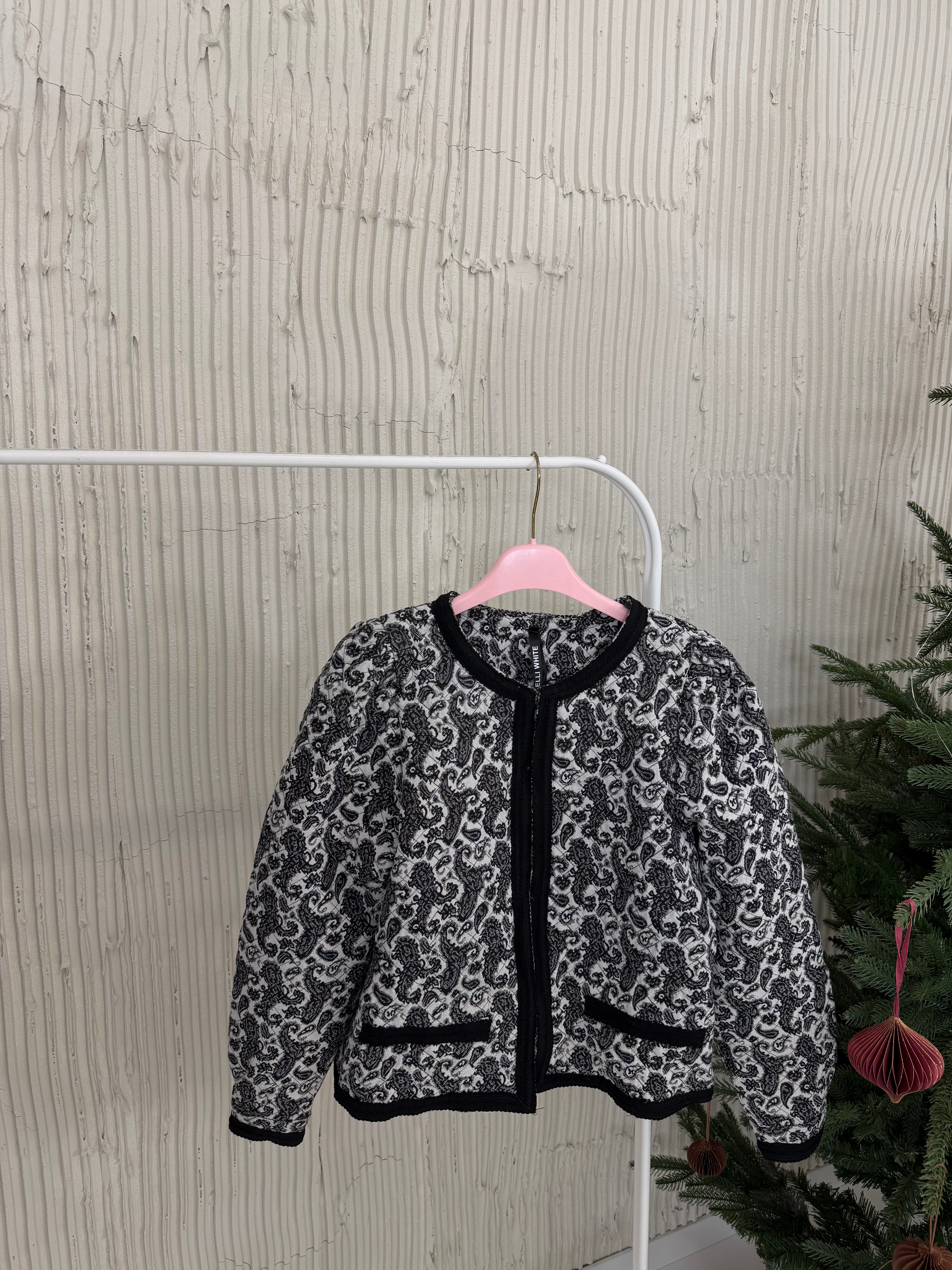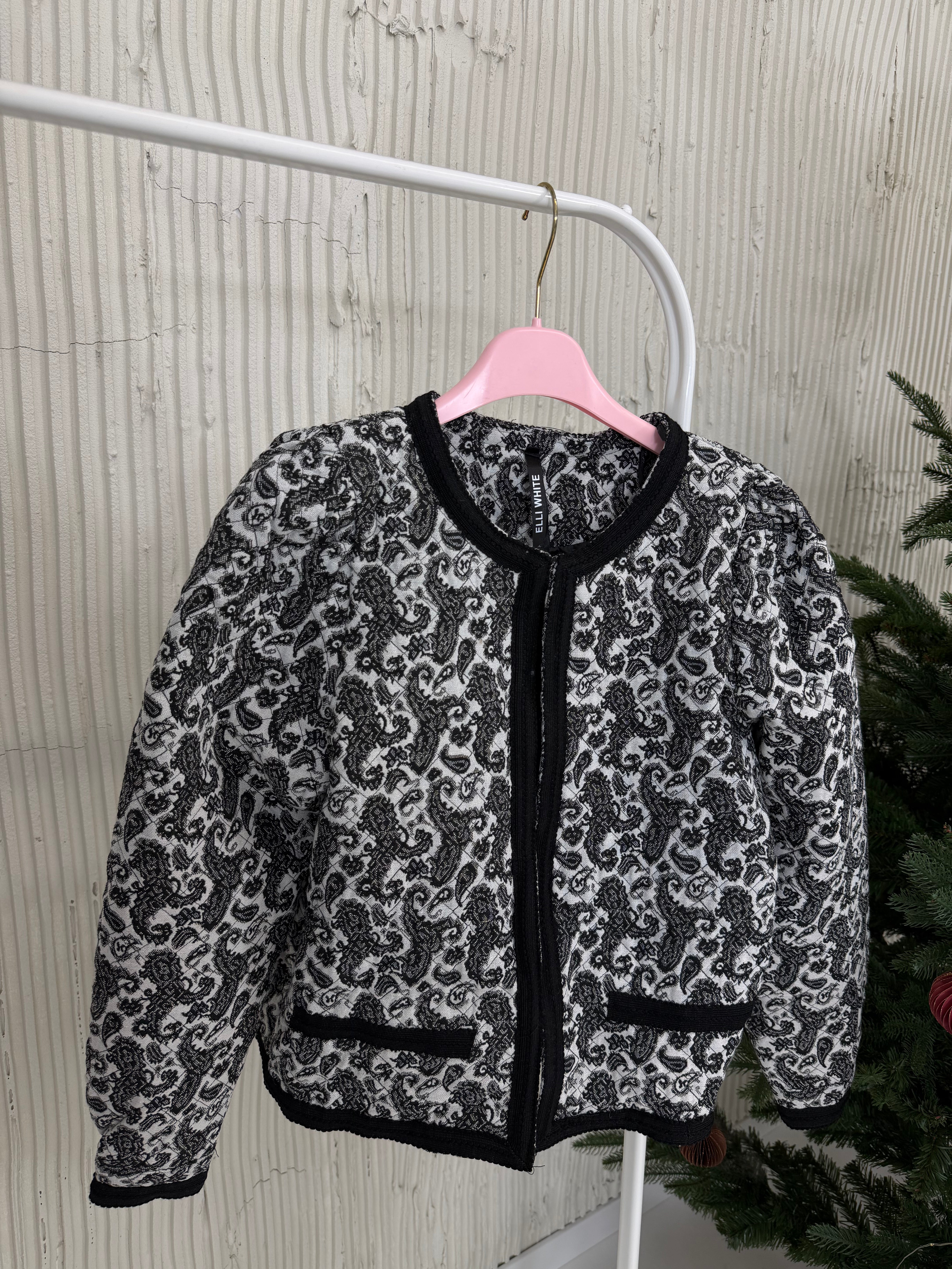 Marynarka posiada pudełkowy kształt, wszyte poduszki w ramionach oraz kontrastujące klapy.