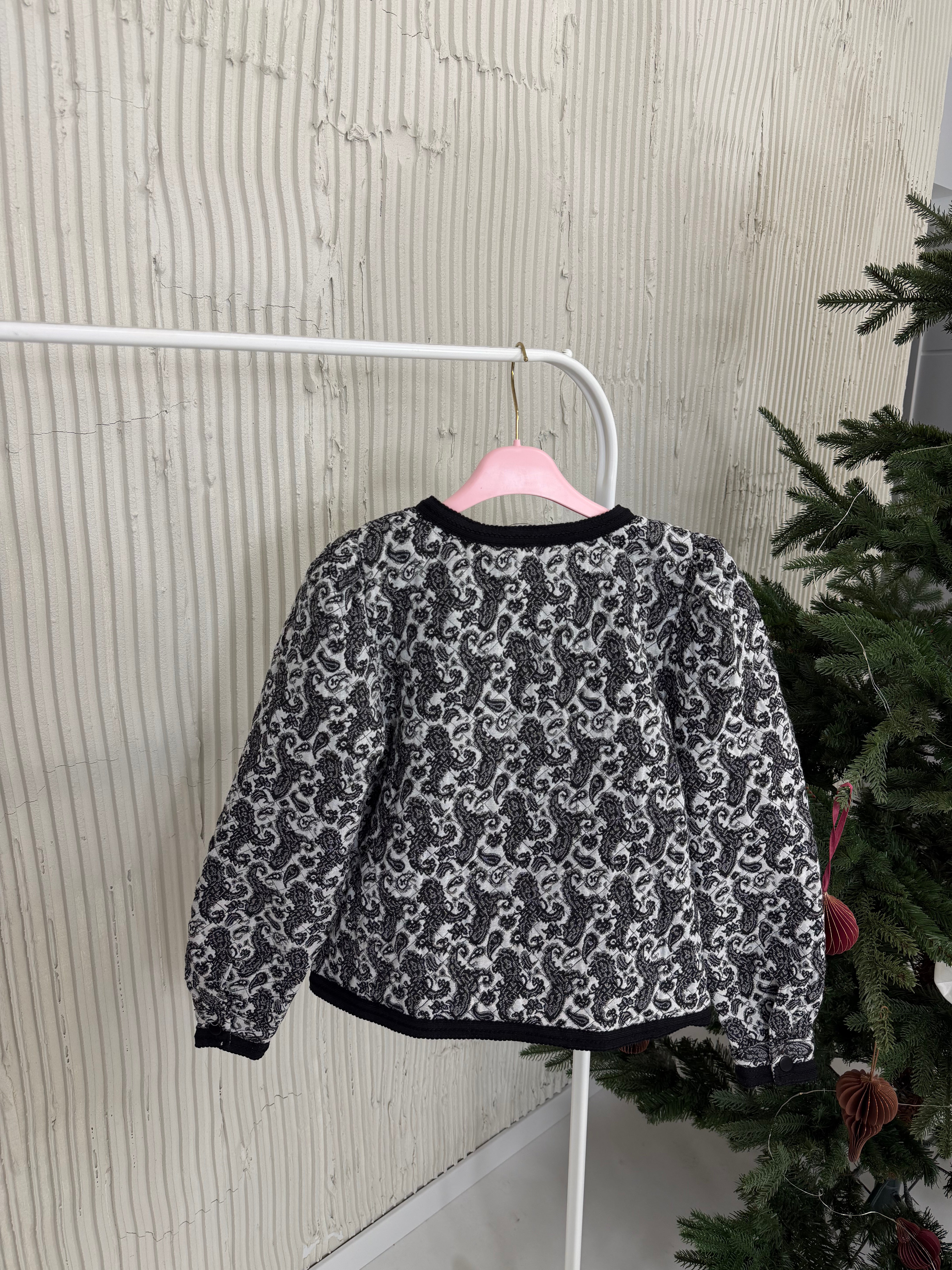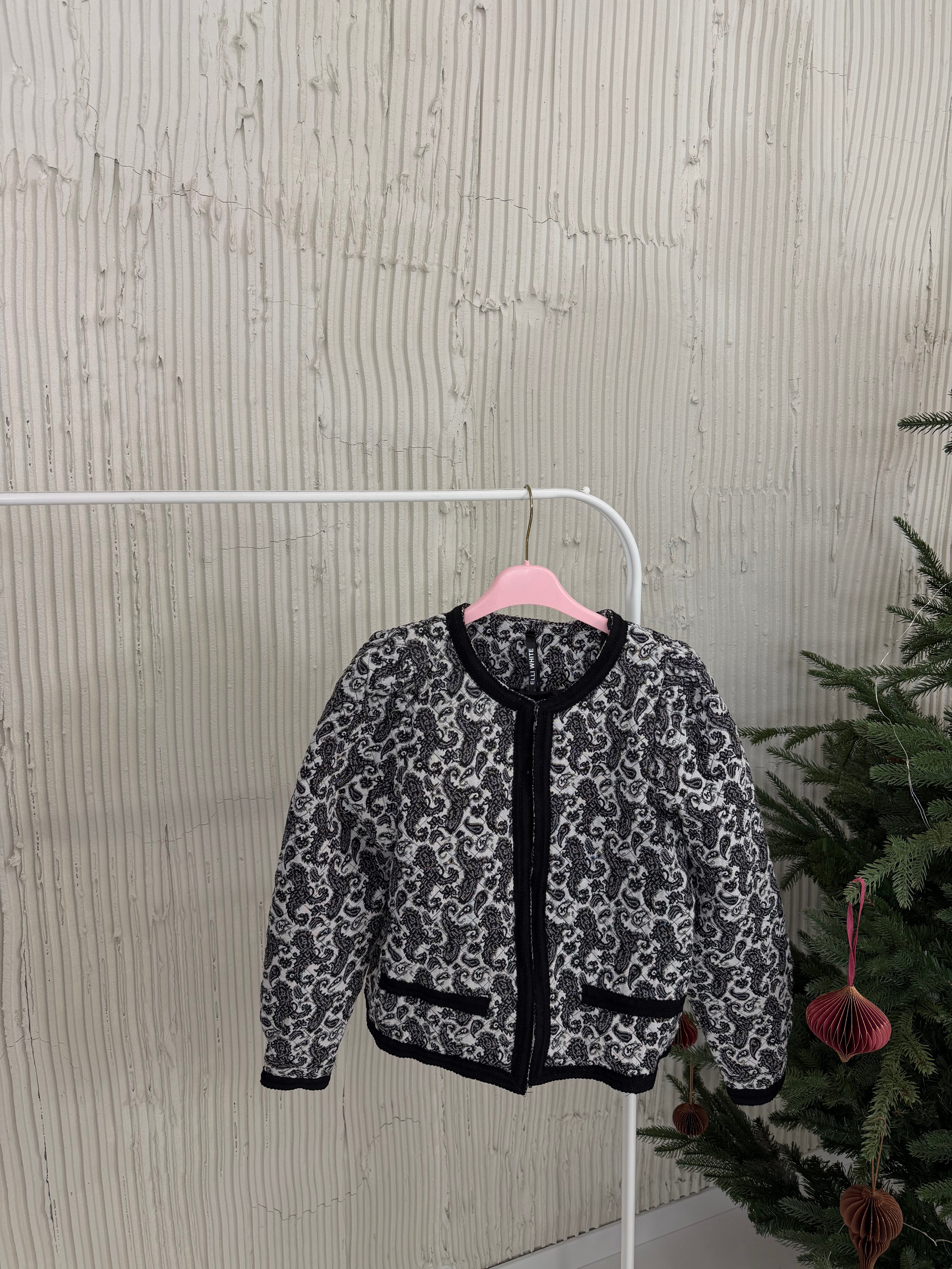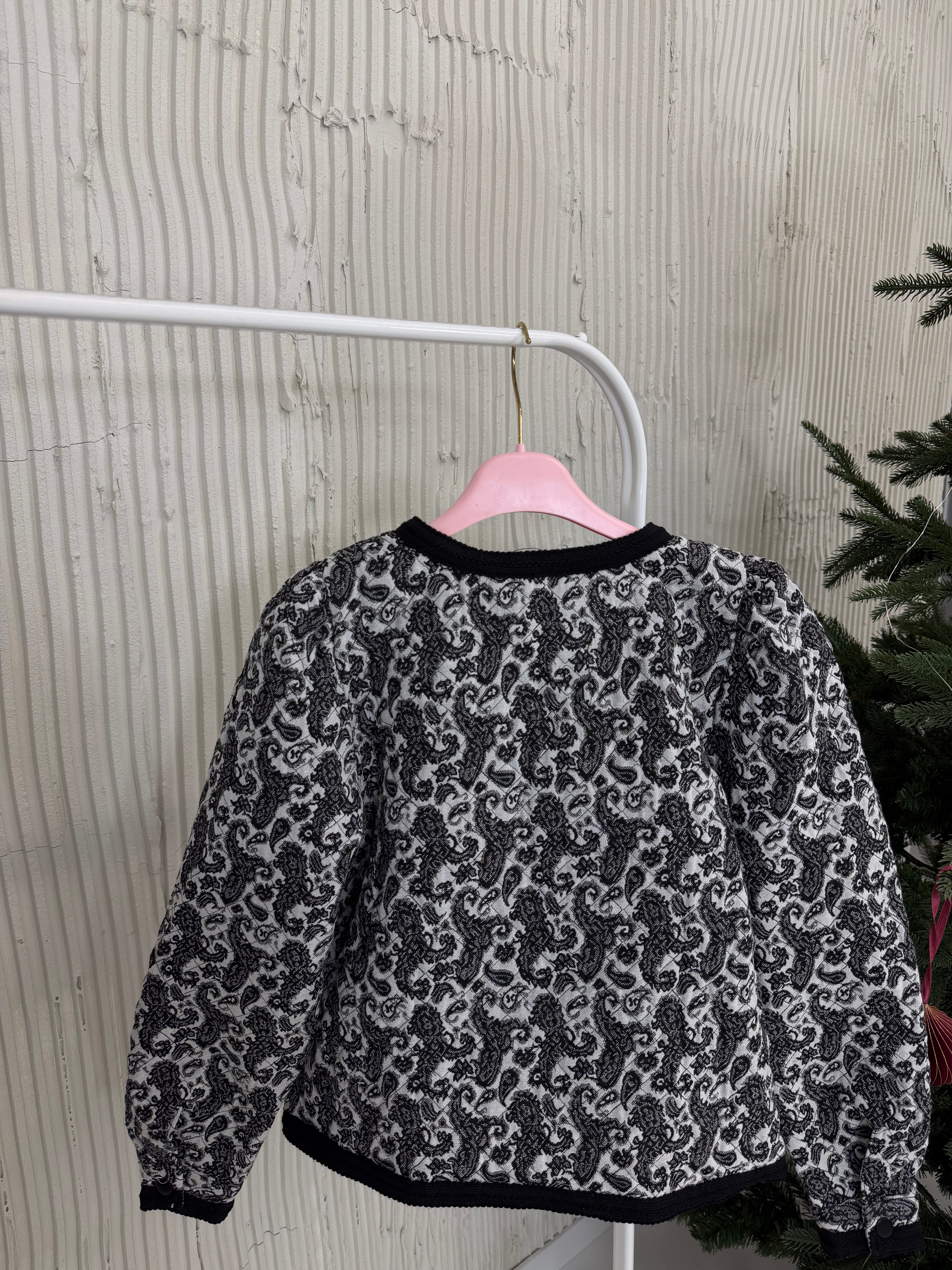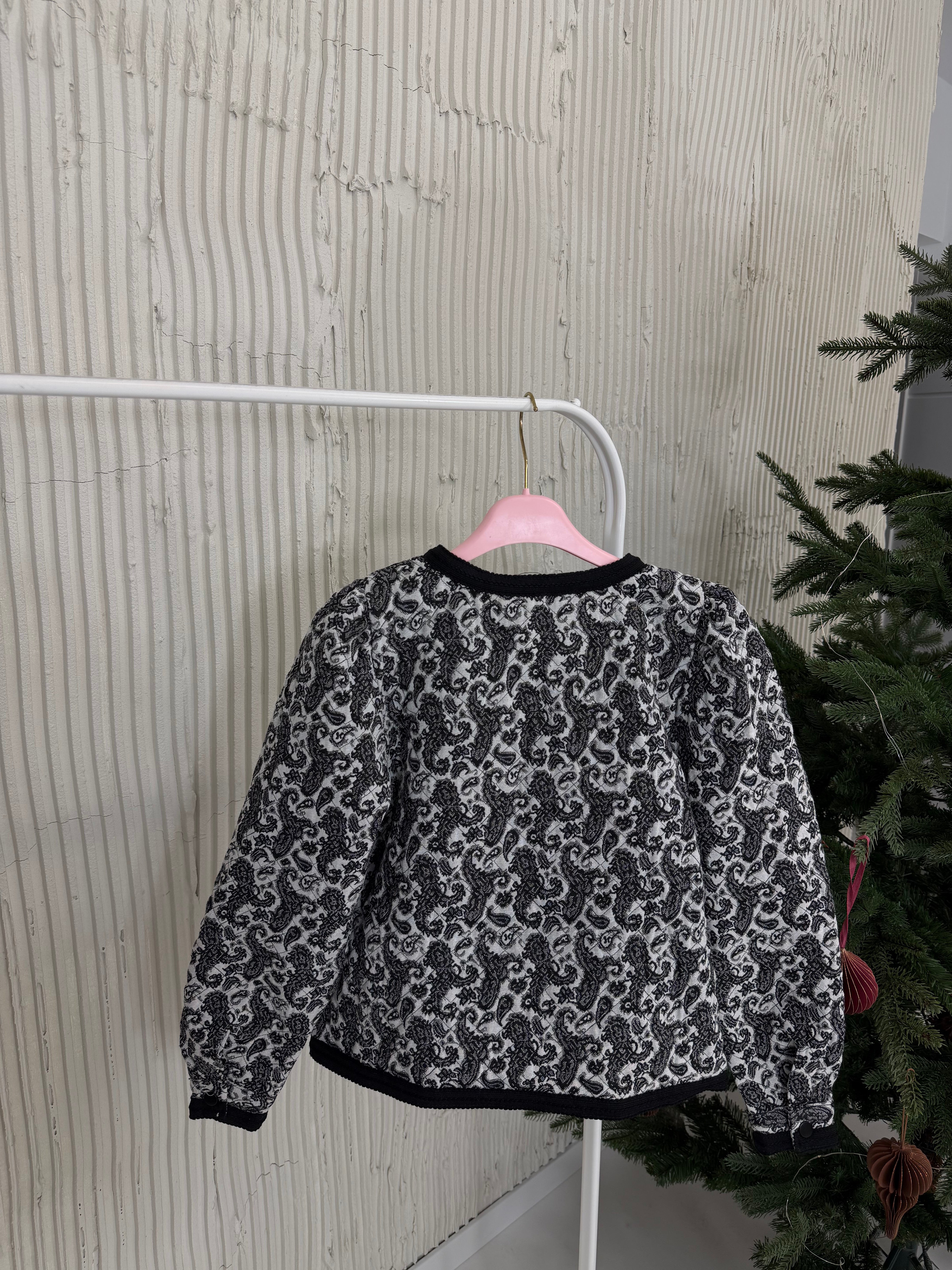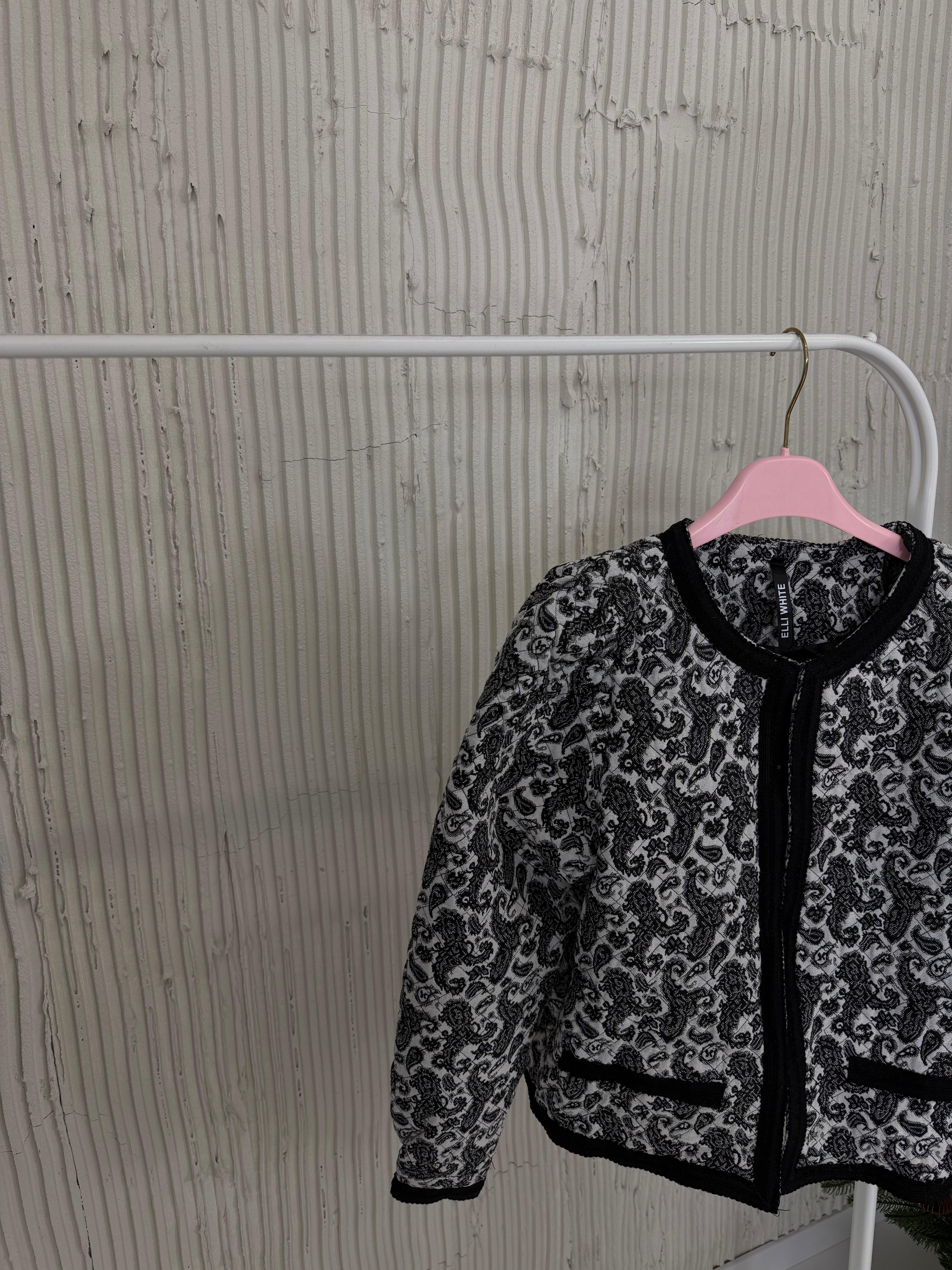 Marynarka posiada pudełkowy kształt, wszyte poduszki w ramionach oraz kontrastujące klapy.