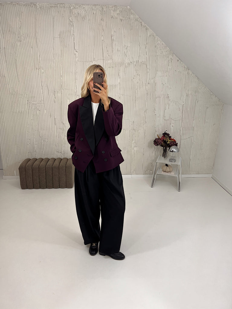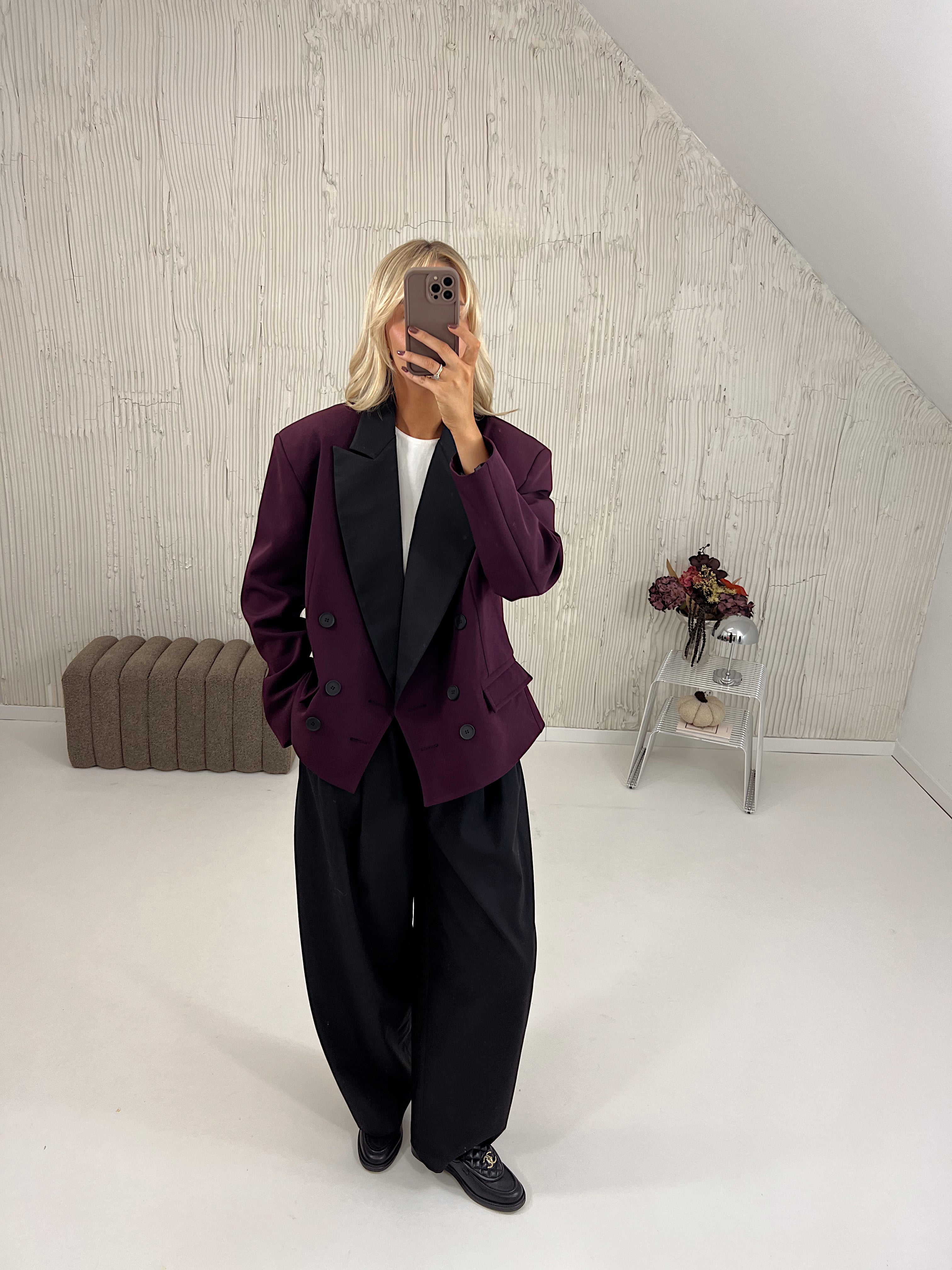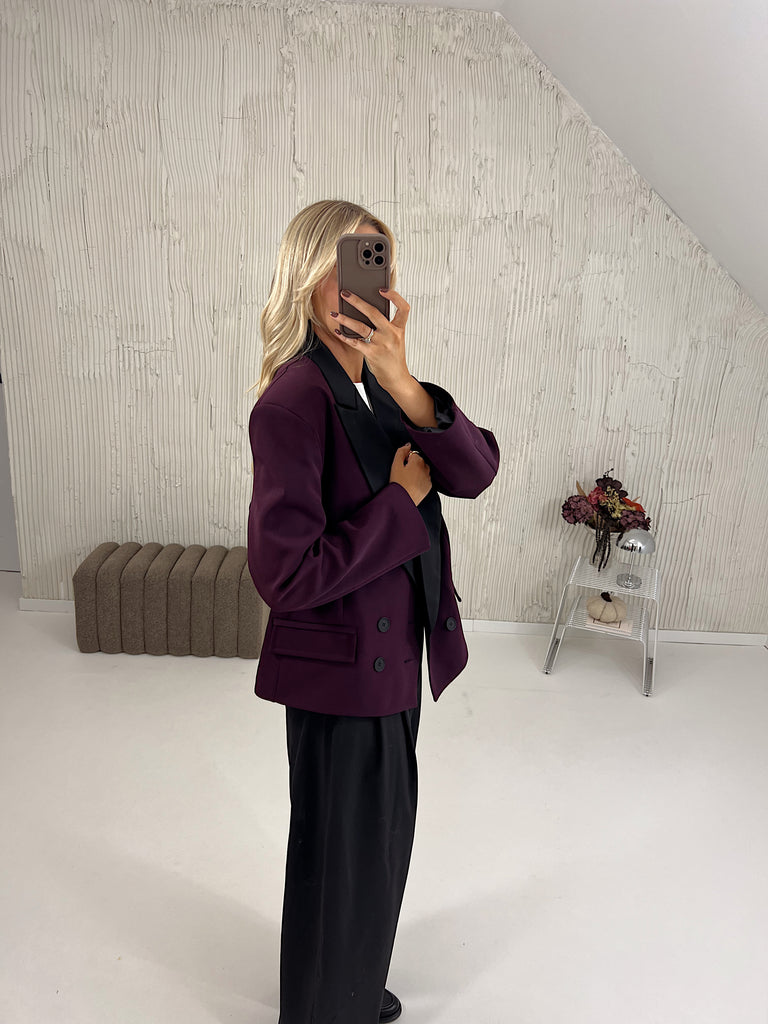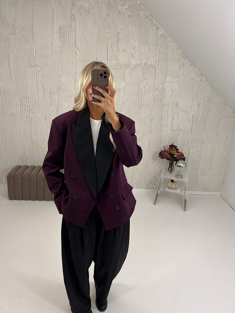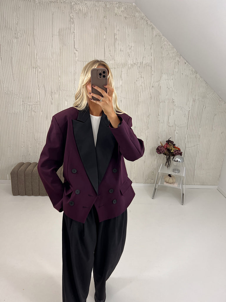 Marynarka posiada pudełkowy kształt, wszyte poduszki w ramionach oraz kontrastujące klapy.