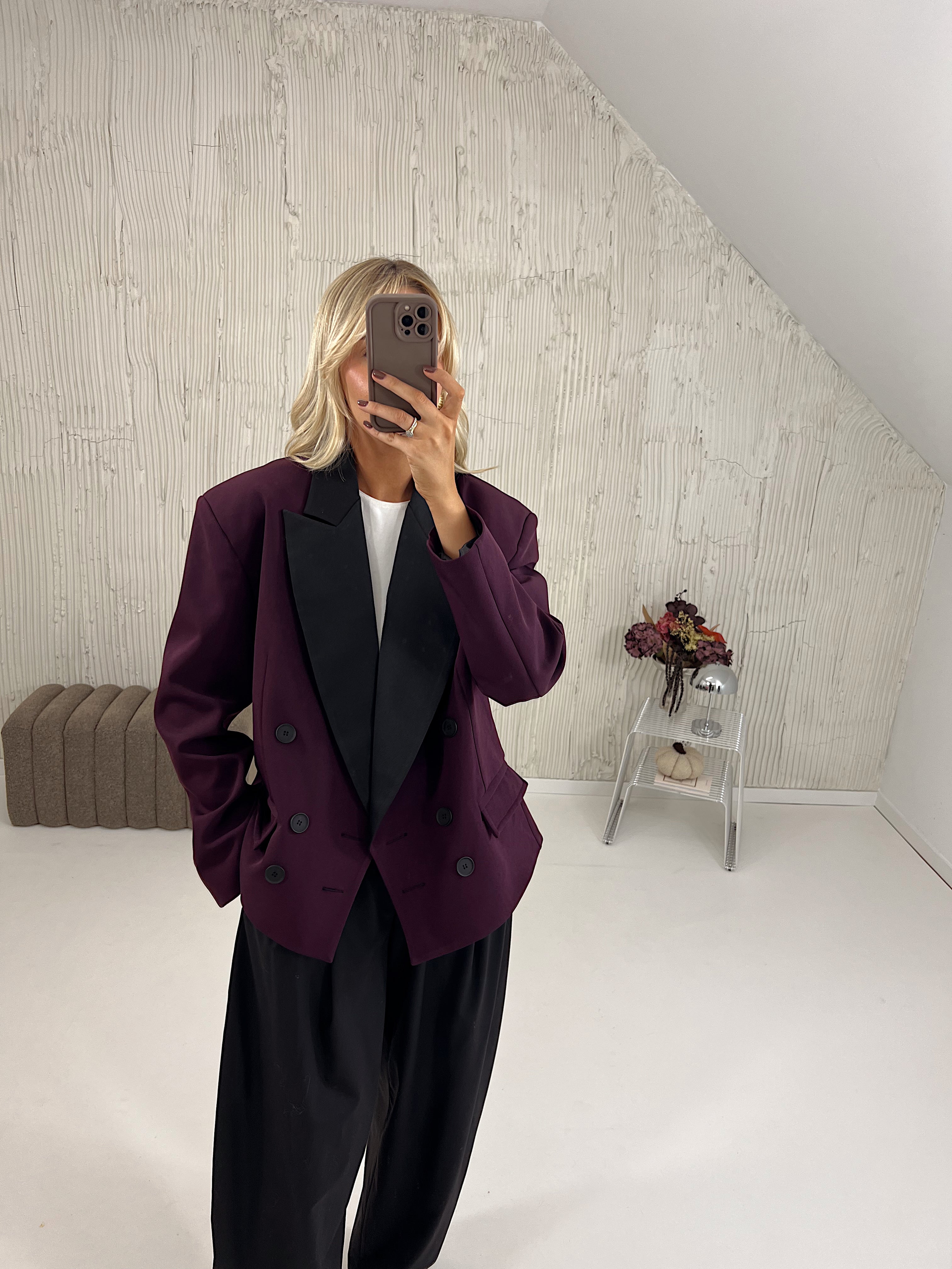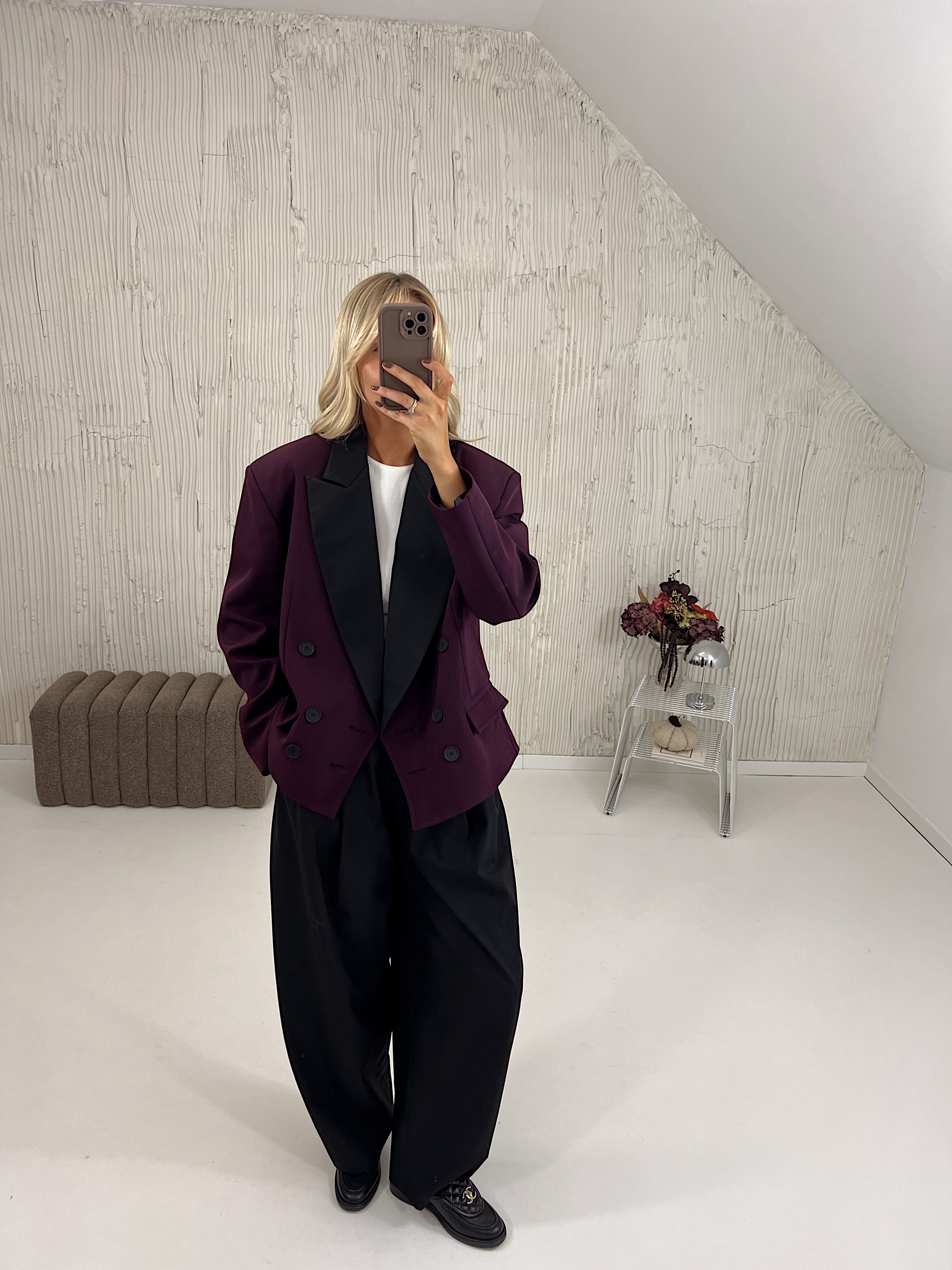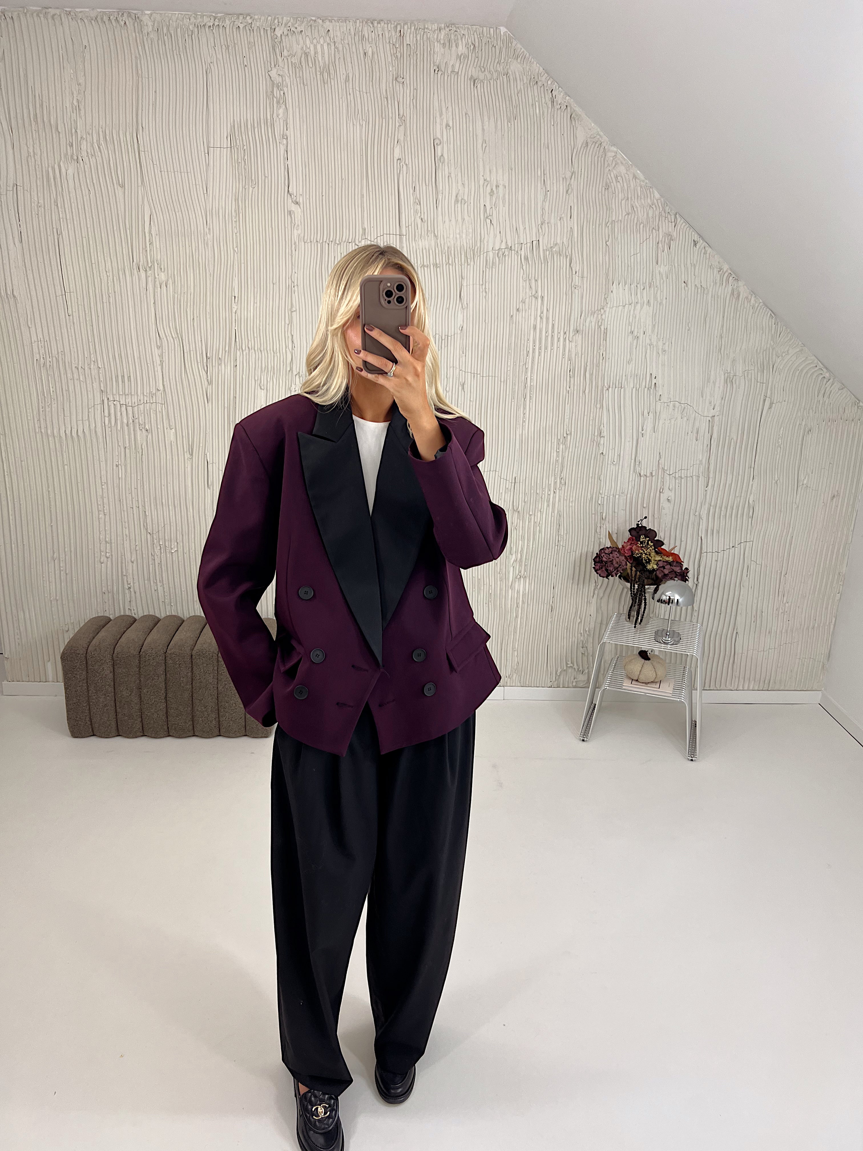 Marynarka posiada pudełkowy kształt, wszyte poduszki w ramionach oraz kontrastujące klapy.